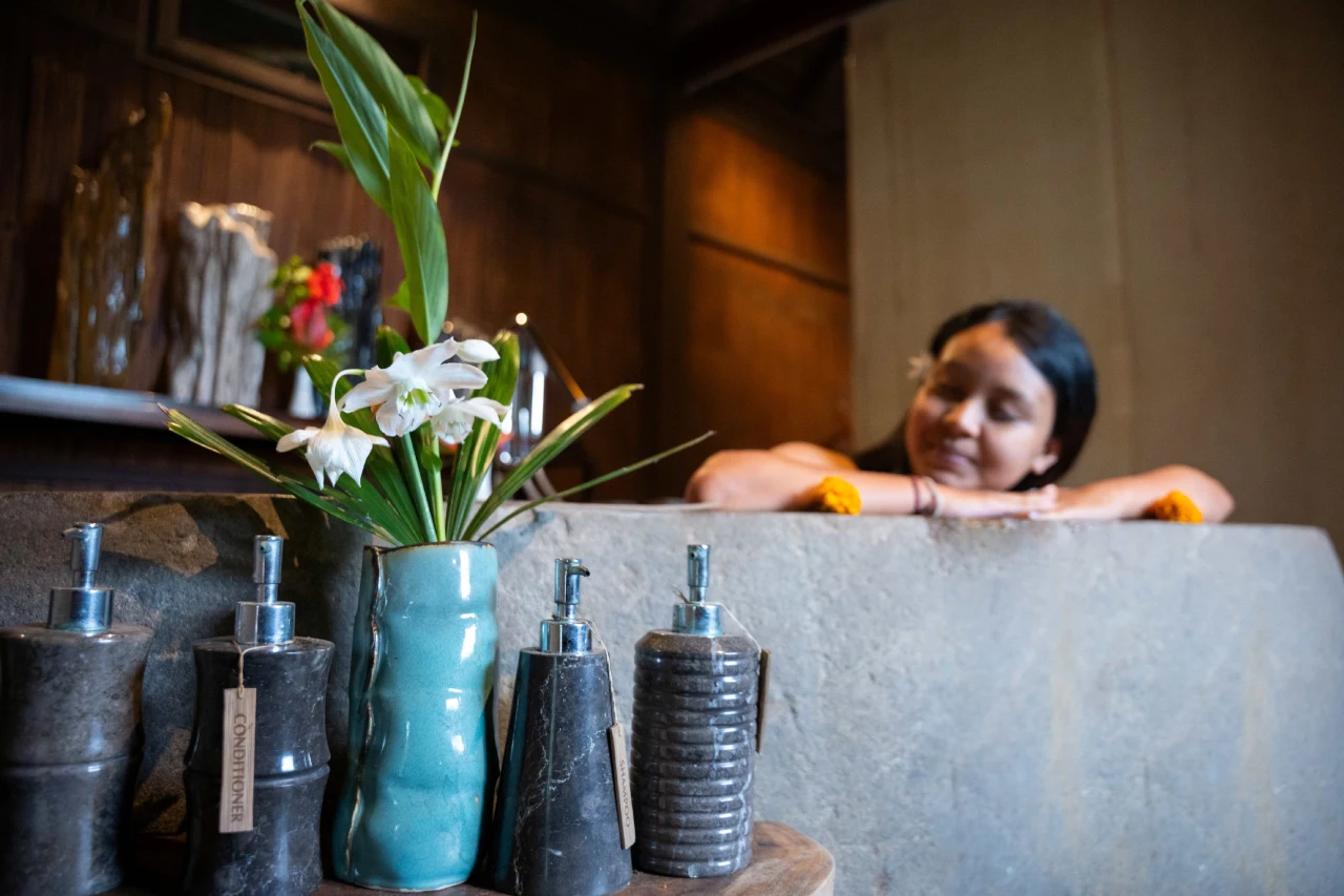 Flower salt foot wash, body massage using ginger oil, followed with warm spices wrapped in white cotton.